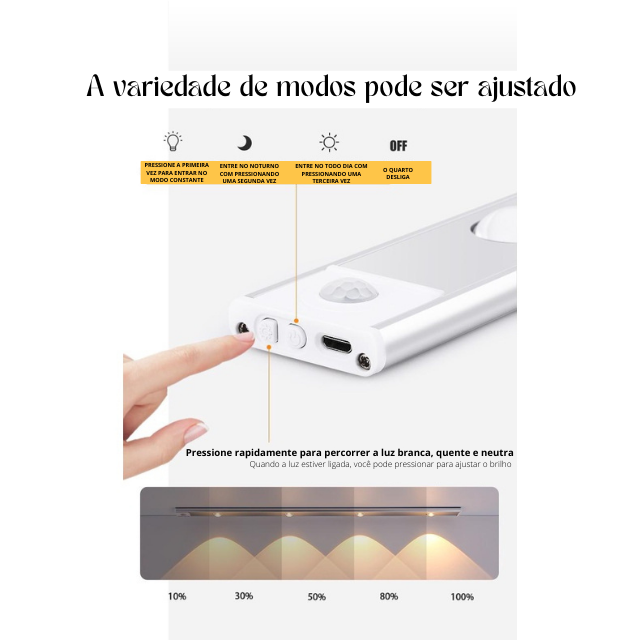 A fonte de alimentação é uma bateria recarregável, e a luz pode ser carregada facilmente com o cabo USB incluso. Além disso, ela possui um sensor de movimento PIR, que ativa a luz automaticamente quando detecta a presença de alguém no ambiente.